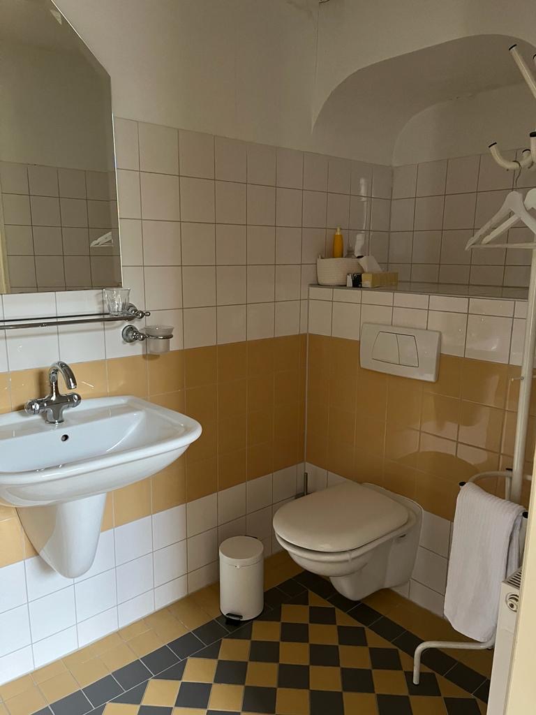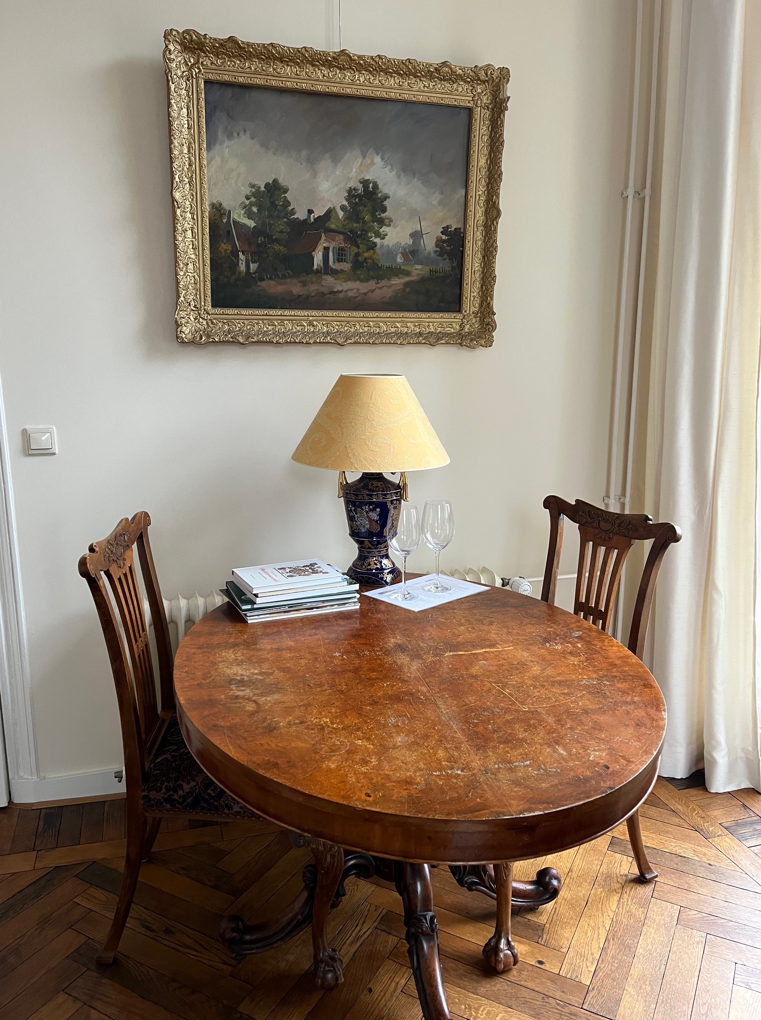 De ‘Balkonkamer’ is een royale tweepersoons kamer met eigen badkamer en suite en een balkon aan de voorzijde van het huis, met uitzicht op de laan, het plein en de tuin. En met openslaande deuren naar het balkon boven de entree. Er is een comfortabel tweepersoons boxspring bed, een klassiek zitje met charmant bankje en fauteuil en een fraaie antieke eettafel met twee stoelen. In de boekenkast staat een ruime collectie om te lezen. De vloer is een antiek frans eiken parket, visgraat gelegd en boven het bed zie je de ‘hanging gardens’ van behangkunstenaars Snijder en Gimenes. De badkamer beschikt over een inloopdouche, wc en wastafel.