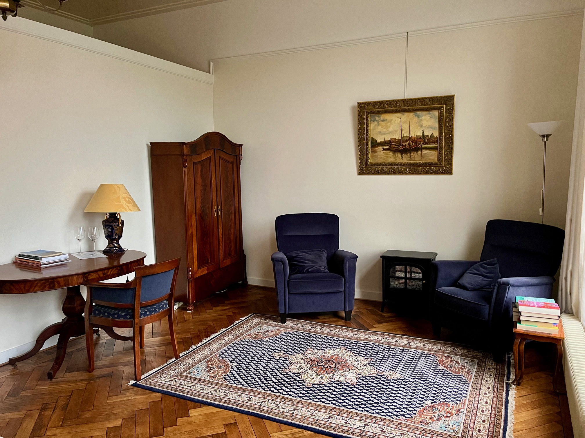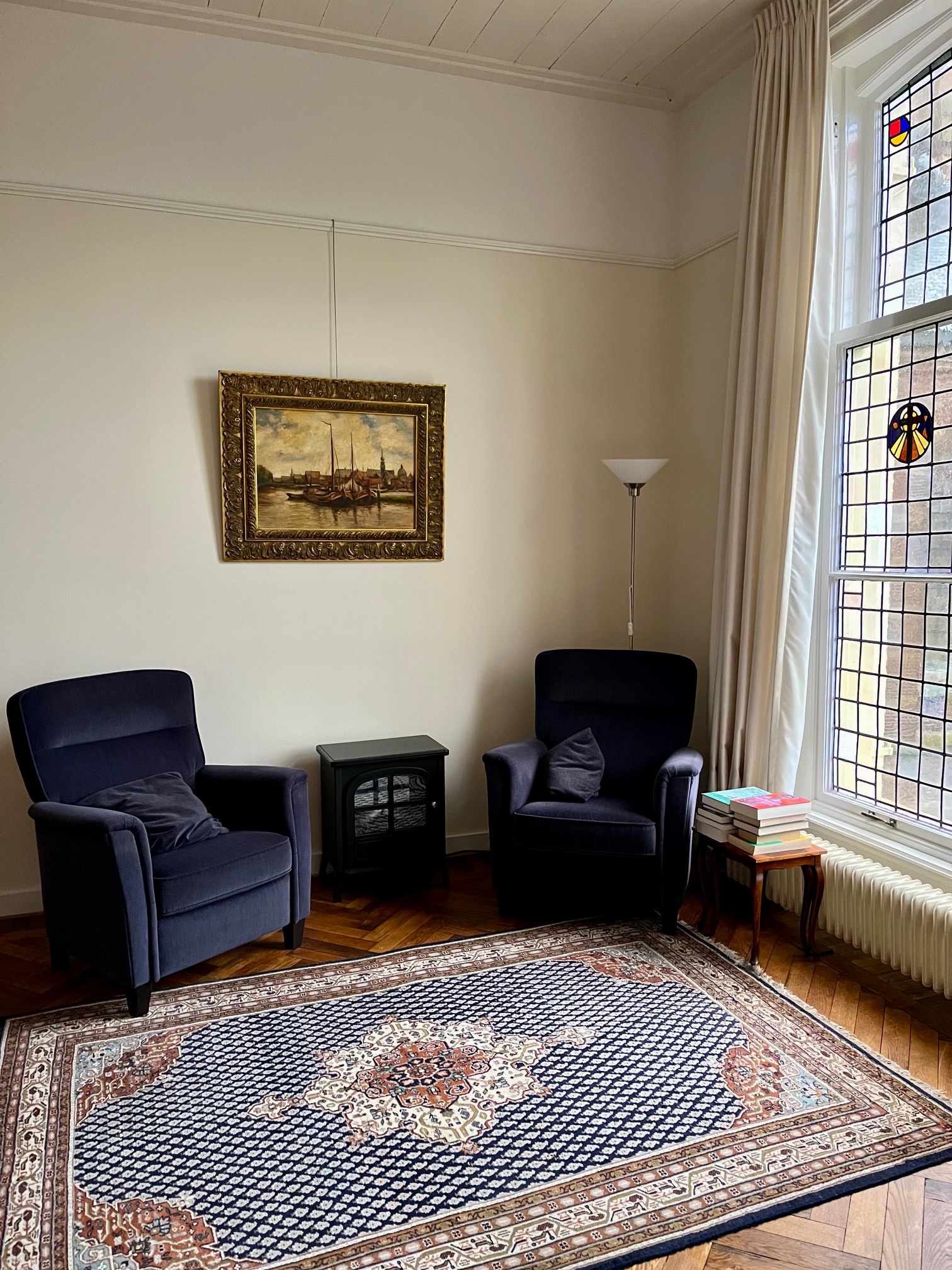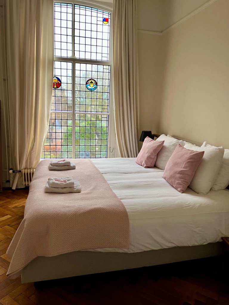De ‘Kapelkamer’ is een grote tweepersoonskamer aan de oostkant van het huis met een eigen badkamer en suite en met uitzicht op de Lourdesgrot of Mariagrot in de tuin. In de periode dat Huis Duistervoorde een klooster was, fungeerde deze kamer als huiskapel voor de zusters. De glas in loodramen herinneren daar nog aan, met de gebrandschilderde medaillons met symbolen van de eredienst. De kapelkamer heeft een groot boxspring bed dat lits jumeaux gedekt is. Er zijn twee royale makkelijke fauteuils, een antieke kast om bagage in te hangen, een antieke tafel en een selectie boeken. De badkamer heeft een inloopdouche, wc en wastafel.